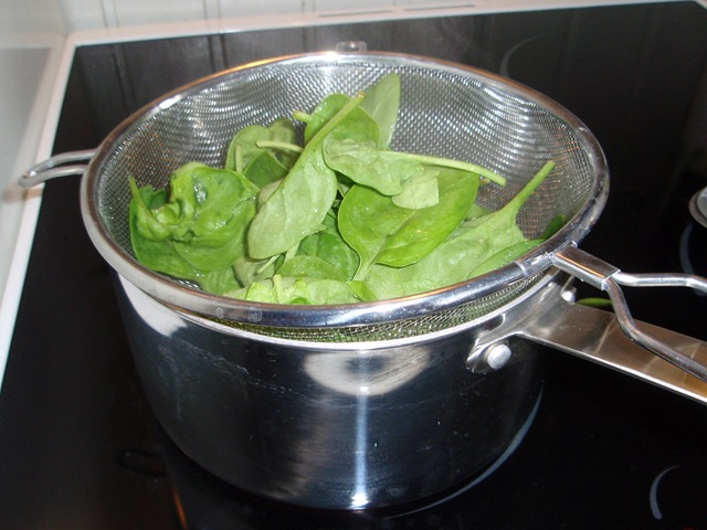 Start med spinaten. Den friske spinat skylles grundigt og derefter dampes den, til den bliver mørkegrøn og begynder at krølle let sammen. Jeg har ikke nogen grøntsagsdamper, så jeg bruger en gryde med kogende vand, min køkkensi, låg på gryden og så dampe lidt ad gangen. Det fungere fint. Hvis det er frossen spinat, så tø den op. Enten i en gryde med lidt vand, eller i microovnen. Spinaten puttes på en serveringstallerken eller på flere tallerkner, hvis det er portionsanretninger.