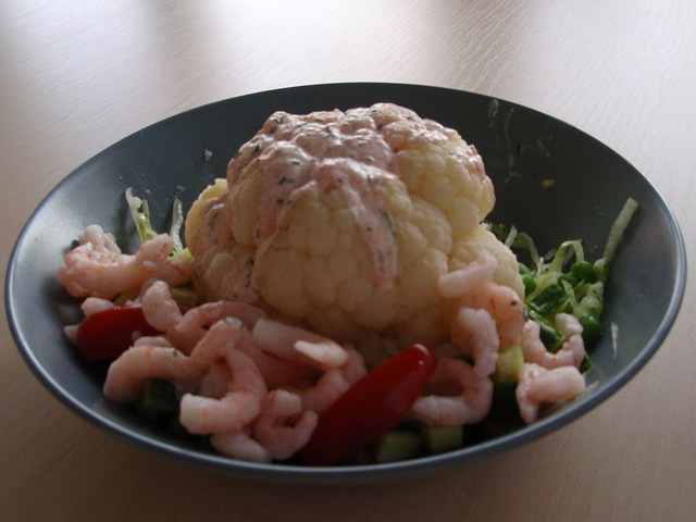 Jeg starter med at lægge salaten i bunden af et fad (eller en stor dyb tallerken) og så placerer jeg blomkålet ovenpå. Resten af salaten lægger jeg lagvis omkring blomkålet og slutter af med rejerne. Til sidst hælder jeg lidt dressing over blomkålet, og servere resten i en lille skål ved siden af.